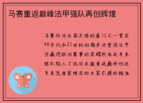 马赛,作为法国足球的豪门之一,曾在90年代和21世纪初期多次登顶法甲并赢得欧洲赛事的荣耀。然而,近年来球队陷入了低谷,未能重返巅峰。但近年来,凭借管理层的决策、引援的精准、战术的革新以及球员状态的回升,马赛逐步恢复了昔日的辉煌,正在走向重新崛起的道路。本文将从四个方面详细阐述马赛重返巅峰法甲强队的历程,以及其在未来实现辉煌的潜力。